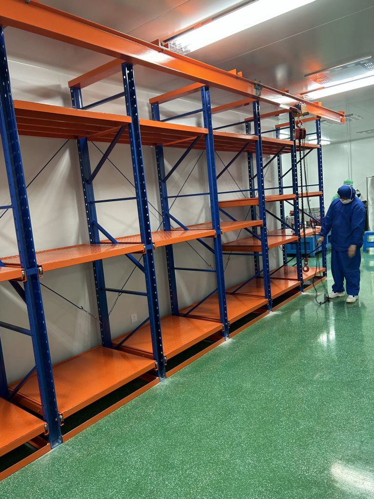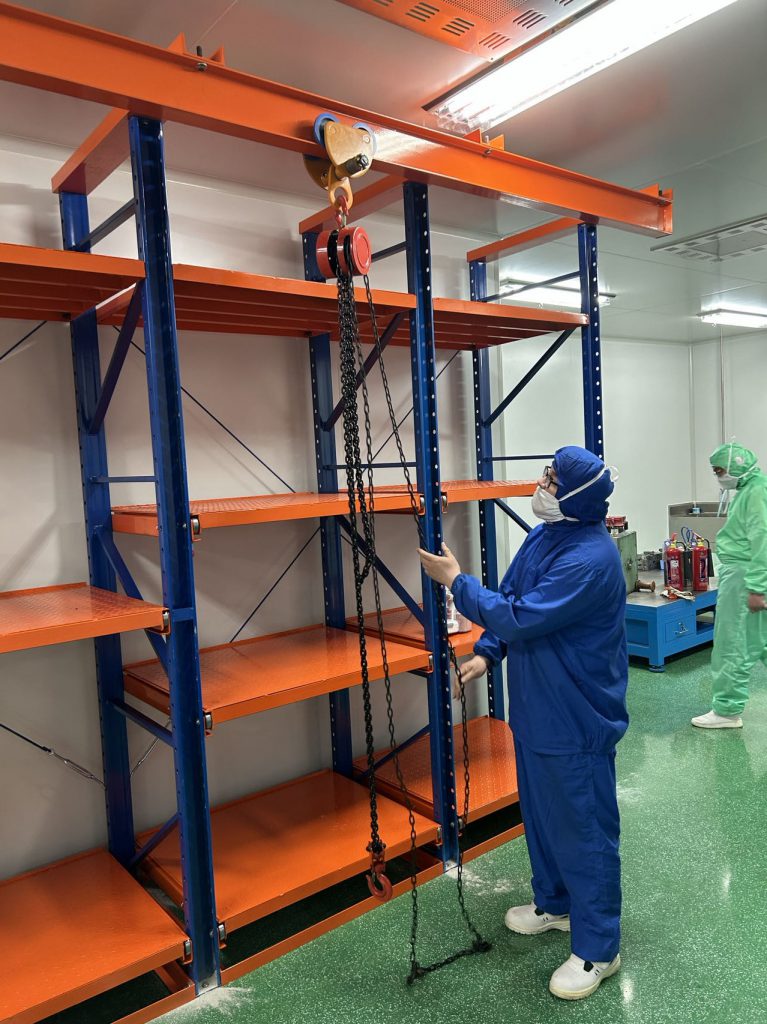 無塵生產車間采用的是常規模具存放方式,模具不接觸托盤,模具更換保養后直接配合工字鋼天車存放在模具架上;